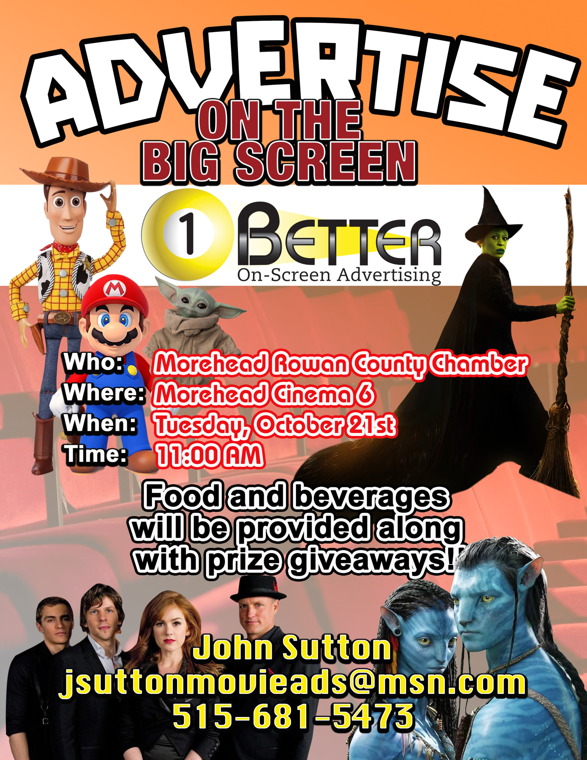 Discover the Power of Cinema Advertising! Join us on Tuesday, October 21 at 11 AM at Morehead Cinema for a special informational meet and greet with 1Better Advertising. Learn how advertising on the big screen can help your business reach highly engaged audiences, strengthen brand recall, and support your local community. This is a great opportunity for Chamber members to explore impactful marketing strategies that put your business in front of an attentive audience.Images